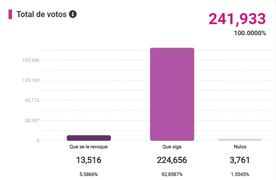El gran apoyo que le brindan las y los tlaxcaltecas al mandatario federal fue refrendado durante el proceso electoral, pues de 241 mil 933 el 92.85 por ciento opinó que debe seguir, mientras que el 5.58 por ciento dijo que se le debe revocar y el 1.55 por ciento fue votos nulos.