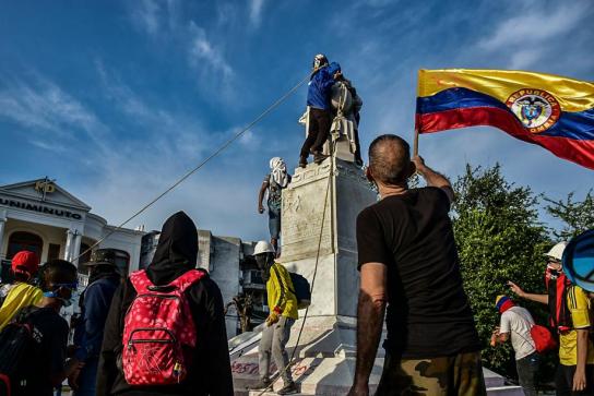 Ataque en Cartagena, 2021, con la consigna ‘Por nuestros muertos’. En toda América Latina, la izquierda declaró la guerra a Cristóbal Colón. (Archivo).