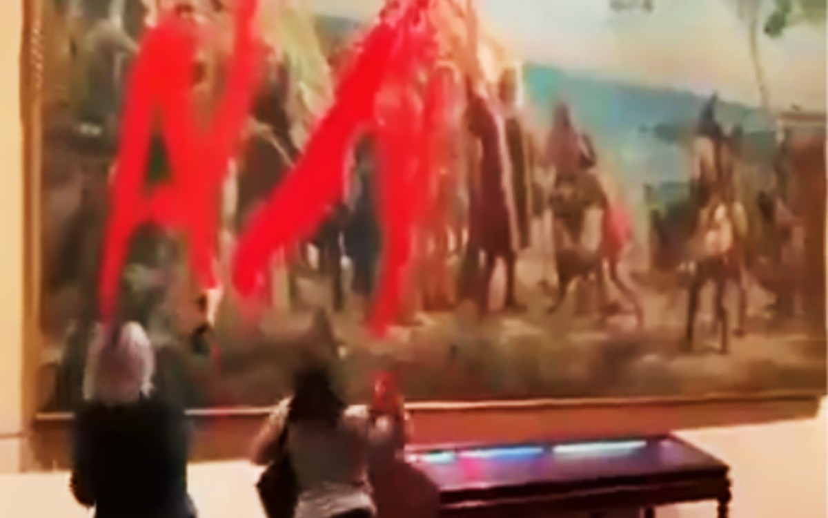 Dicha revisión sesgada de la historia registró un capítulo más el pasado 12 de octubre, cuando al grito de “nada que celebrar. justicia ecosocial”, el colectivo climático Futuro Vegetal atacó el cuadro Primer homenaje a Cristóbal Colón resguardado en el Museo Naval de Madrid.