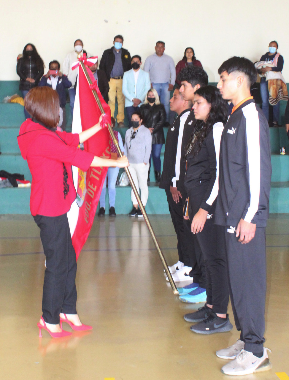 Ante la presencia de los 91 deportistas, la directora del IDET, Madaí Pérez Carrillo abanderó a la escuadra local que verá acción en los deportes de boxeo popular, artes marciales populares y fútbol 6×6.