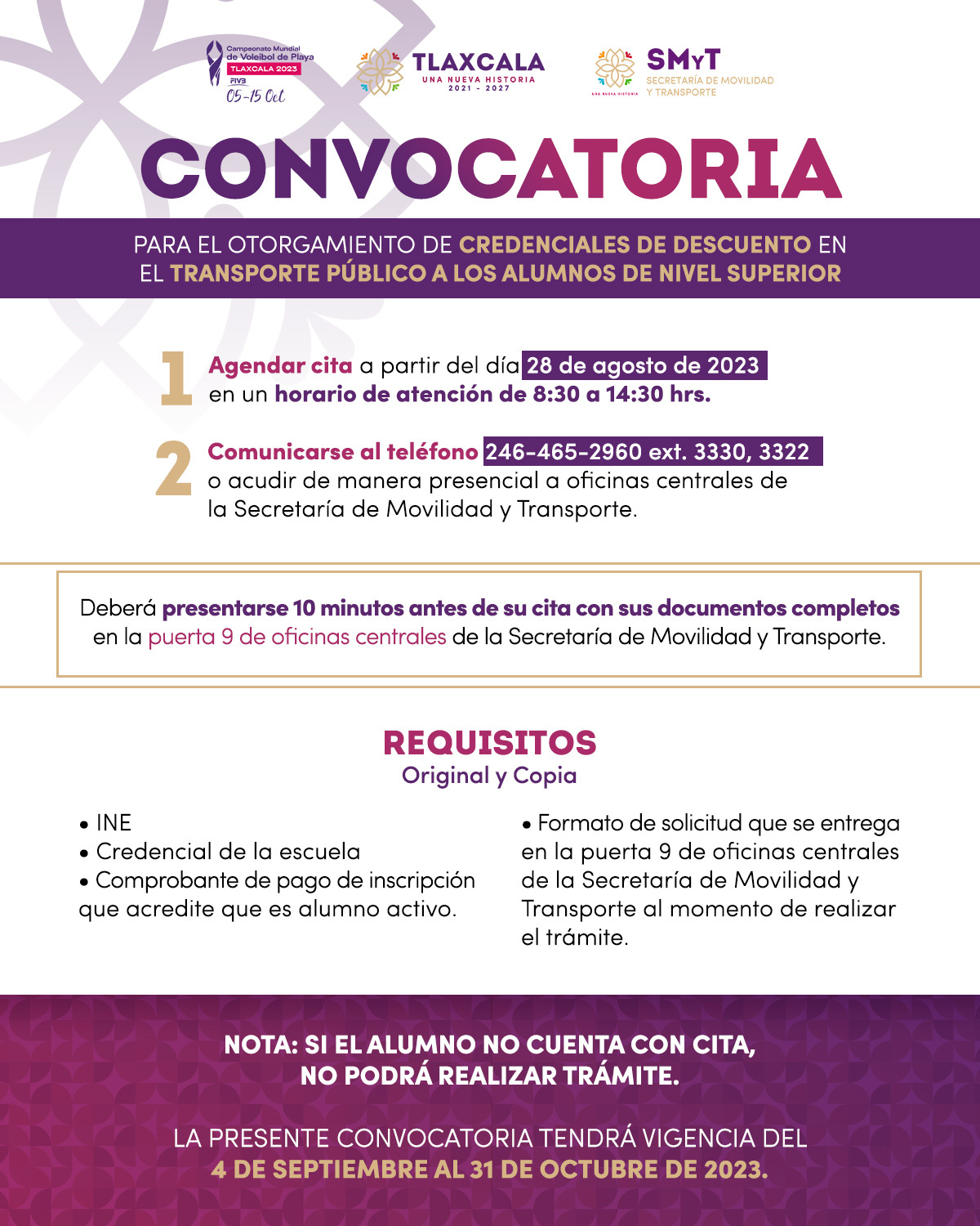 La Secretaría de Movilidad y Transporte (SMyT) abre la convocatoria para que los estudiantes de nivel superior que acuden a escuelas públicas en el estado tramiten la credencial de descuento para el uso del transporte público, por lo que a partir de este lunes 28 de agosto podrán agendar su cita.