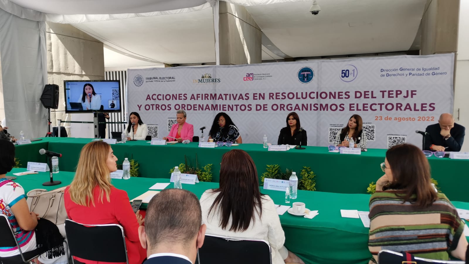 Ante representantes del Instituto Nacional de las Mujeres (Inmujeres), de las Asociaciones Mexicana de Consejeras Estatales Electorales y de magistradas y magistrados electorales locales de los Estados Unidos Mexicanos, así como del Colectivo 50 +1 y la Dirección General de Igualdad de Derechos y Paridad de Género, la Magistrada Presidenta del TET expuso que a partir de la implementación de una acción afirmativa, impulsada desde la jurisdicción electoral, se logró que por primera vez, en la historia del Congreso de Tlaxcala, se integrara en su mayoría por mujeres.