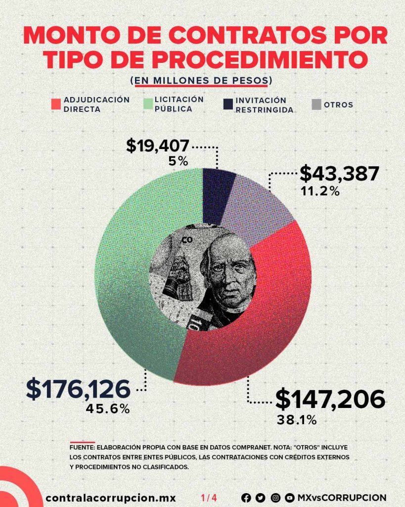 Así, la proporción del monto de las adjudicaciones directas se ha mantenido durante los tres últimos años, por arriba del nivel de los sexenios de Peña Nieto y Felipe Calderón.