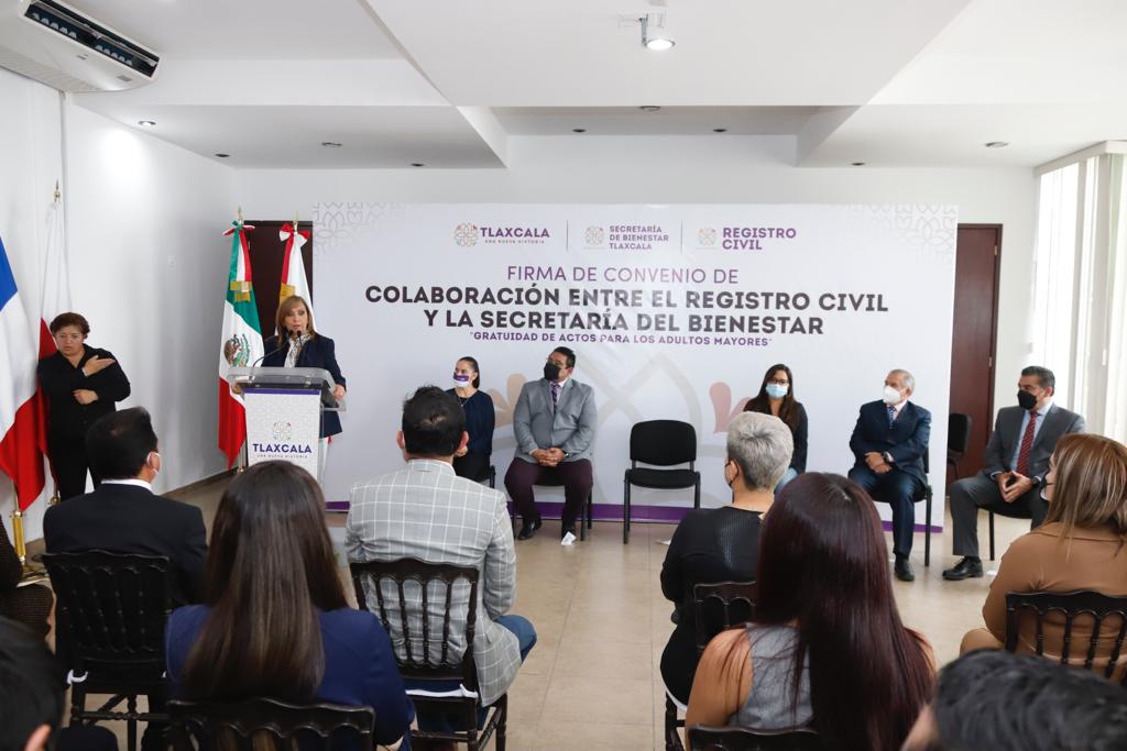 La gobernadora Lorena Cuéllar Cisneros encabezó la firma de convenio entre la Secretaría de Bienestar de Tlaxcala (SBT) y la Coordinación Estatal de Registro Civil, en beneficio de adultos mayores que, por diversas situaciones, no cuenten con su acta de nacimiento, a fin de que no vean limitada su incorporación a los diversos programas sociales que promueve la administración estatal y el gobierno de México.