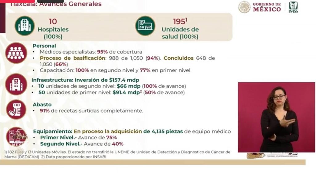 En el estado de Tlaxcala se alcanzó una cobertura de médicos especialistas del 95 por ciento con el sistema de salud IMSS-Bienestar para la atención de personas sin seguridad social, informó el director general del Instituto Mexicano del Seguro Social (IMSS), Zoé Robledo Aburto.