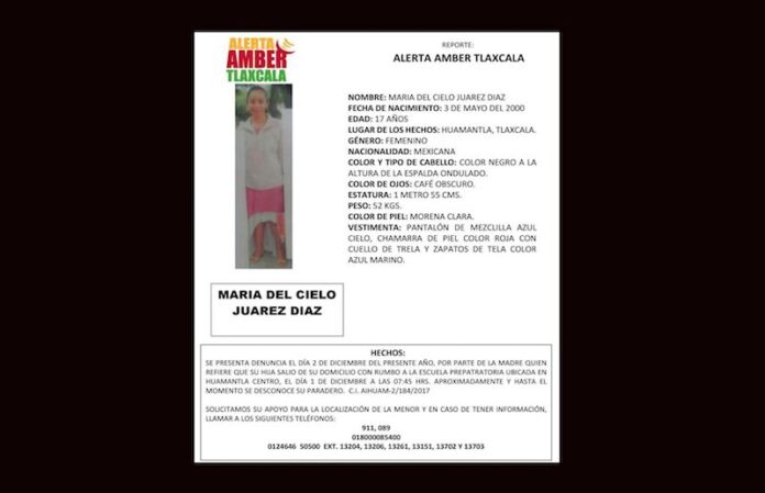 De acuerdo a un reporte de Alerta Amber Tlaxcala emitido este domingo 2 de diciembre, la menor María del Cielo Juárez Díaz, quien de acuerdo a la denuncia presentada por la madre refiere que “su hija salió de su domicilio con rumbo a la escuela preparatoria ubicada en Huamantla centro, el día 1 de diciembre a las 7:45 de la mañana, y hasta el momento se desconoce su paradero”.