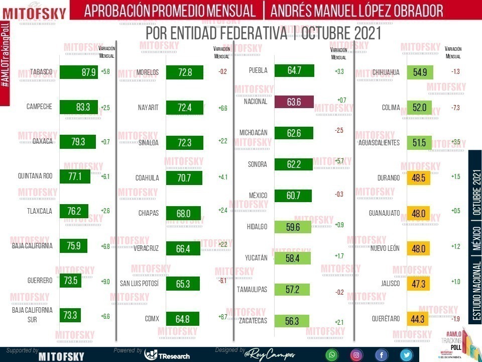 Al comparar las estadísticas de Consulta con el mismo mes de octubre, pero del año 2020, se observa que de entonces a la fecha hubo un incremento de 7% a nivel nacional; y de 9% en Tlaxcala, al pasar la aprobación del presidente de 68% a 76%.
