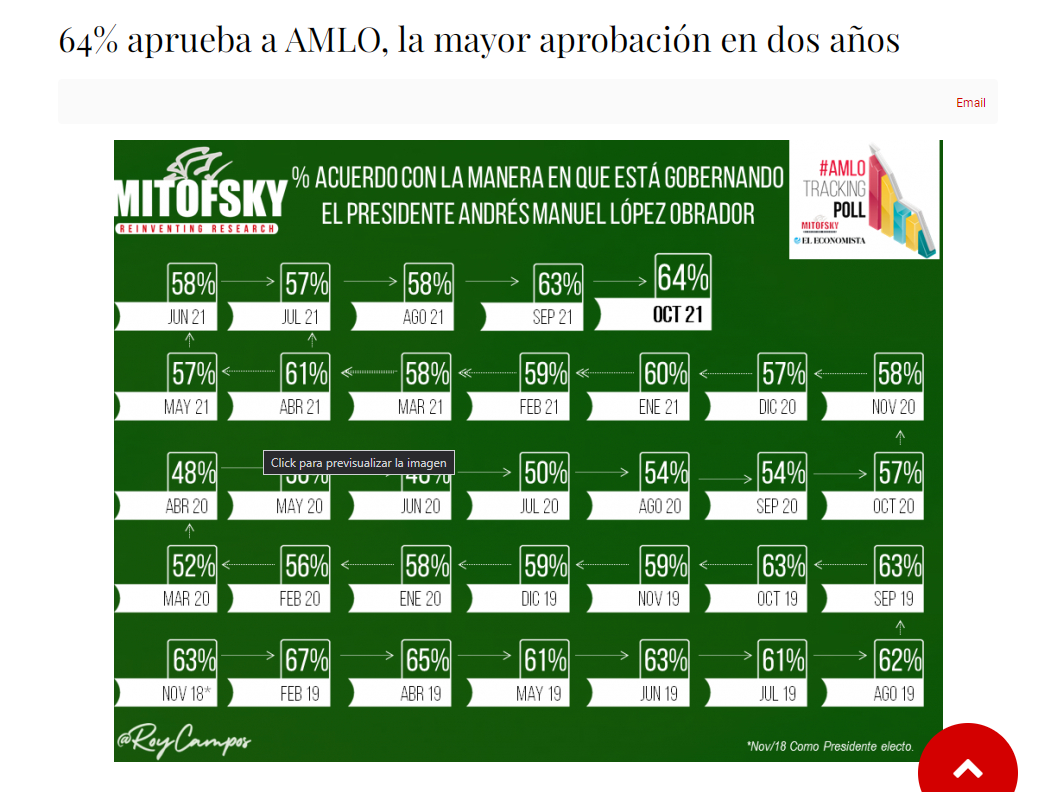 “Este es el tercer registro más alto desde que inició la medición de aprobación y la cifra más alta desde octubre de 2019 (63%)”, reportó el conocido despacho que cumple desde 2018 un seguimiento diario de la aceptación del mandatario mexicano.