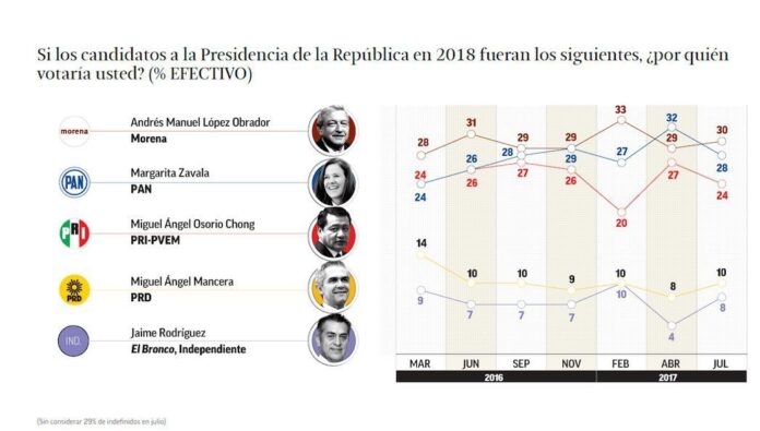 Según una encuesta del investigador Alejandro Moreno para el diario mexicano El Financiero, basada en una muestra probabilística de 1200 entrevistas levantada en todos los estados del país, Andrés Manuel López Obrador y Margarita Zavala de Calderón se hallan en empate técnico a once meses de la votación presidencial del primer domingo de junio de 2018.
