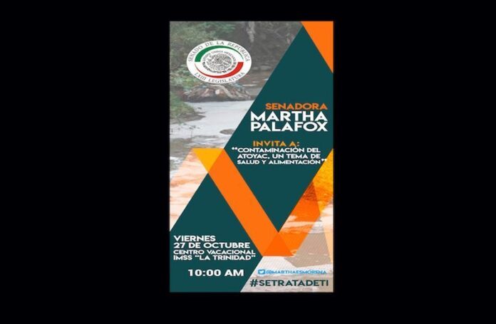 El Senado de la República a través de las comisiones de Agricultura, ganadería y Pesca, la mesa directiva y la comisión especial de Autosuficiencia Agroalimentaria, invitan a la reunión de trabajo «Contaminación del río Atoyac: Salud y Alimentación» que se realizará el próximo viernes 27 de octubre en las instalaciones del Auditorio del Centro Vacacional IMSS «La Trinidad» a partir de las 10:00 AM.