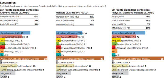 En efecto, en tal escenario sin FCM Anaya capta 18% de preferencia bruta (entre 20- 21 puntos netos) contra apenas 5% (6 neto) del actual jefe de gobierno de la CDMX, en tanto que AMLO capta 30% (34% neto) y Meade 16% (18% neto).