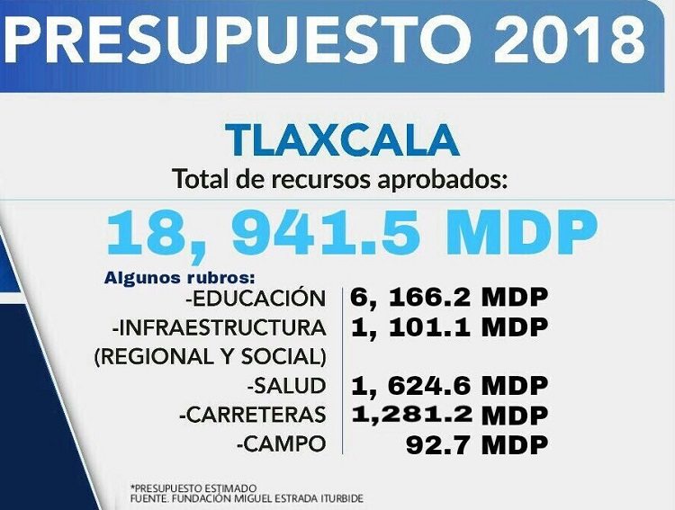 El presupuesto federal 2018 para Tlaxcala se distribuye –según estimaciones de la Fundación Miguel Estrada Iturbide, grosso modo entre otros rubros como sigue: Salud, 1,625 millones (8.6%); Carreteras, 1,281 millones (6.8%); e Infraestructura, 1,101 millones (5.8%).