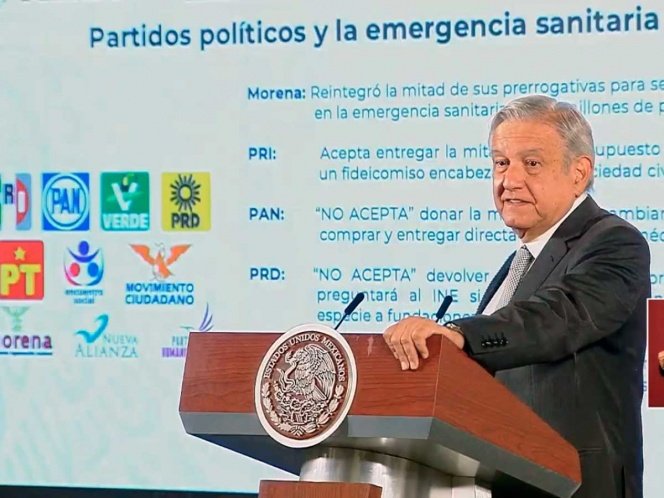 Luego de haber reiterado su llamado a los partidos políticos a donar la mitad de sus prerogativas o lo equivalente en especies para el combate al Covid-19, el presidente Andrés Manuel López Obrador anunció que hasta este momento sólo Morena y el PES aceptaron la propuesta.