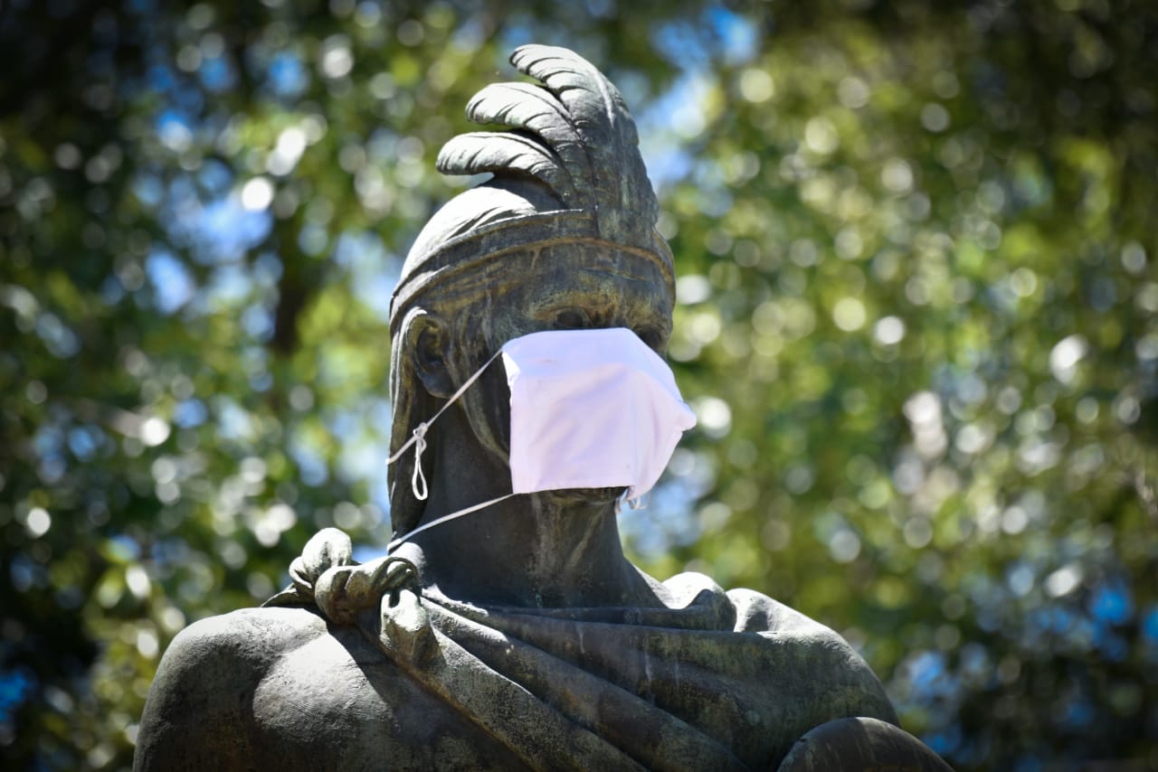 Los héroes locales Tlahuicole y Xicohténcatl, y el héroe nacional Benito Juárez, amanecieron este sábado con tapabocas, cuando la pandemia del covid-19 ha cobrado ya más de 700 vidas en Tlaxcala y casi 56 mil en todo México, según cifras oficiales.