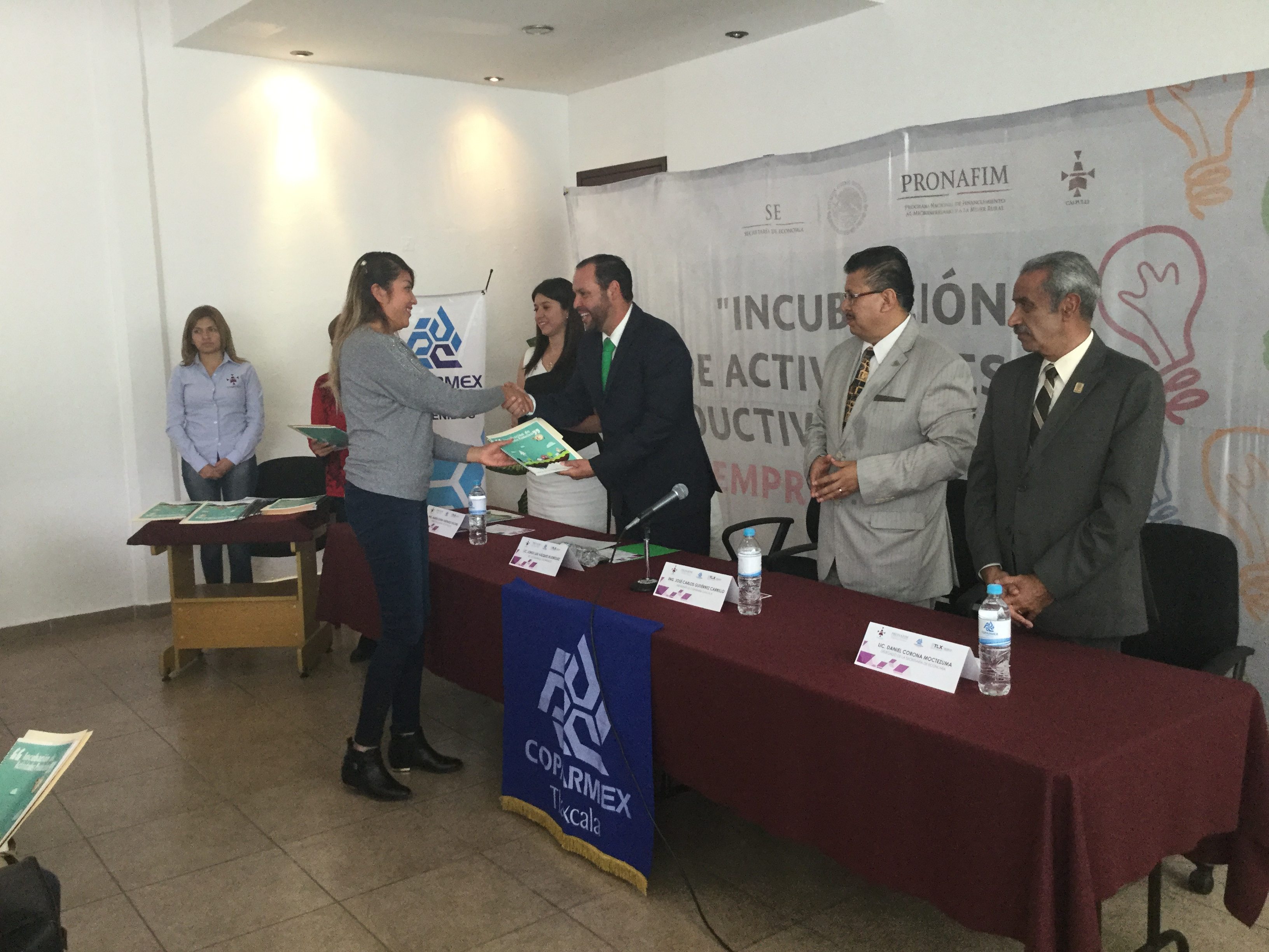 Al evento, que se llevó a cabo en la Sala Emilio Sánchez Piedras de la Sedeco, asistieron José Carlos Gutiérrez Carrillo, Presidente de Coparmex; Daniel Corona Moctezuma, Delegado Federal de la Secretaría de Economía en Tlaxcala; y María Elena Hurtado Vilchis, representante de Calpulli, S.C.