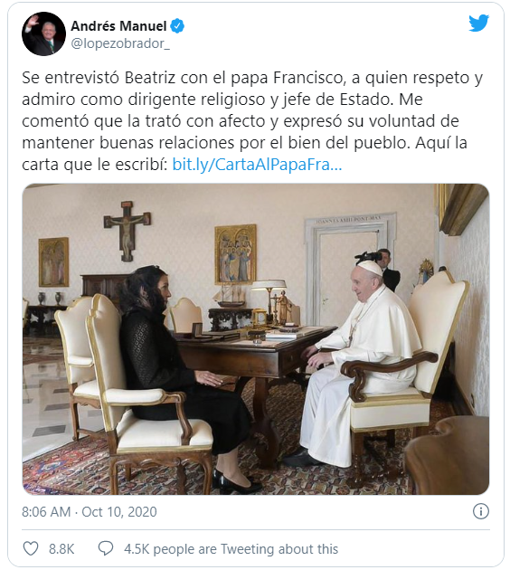 Represento a un gobierno que está llevando a cabo un profundo proceso de transformación cuyo distintivo es la honestidad, la justicia y la austeridad, así como el amor al prójimo, precepto que, considero, es la esencia del humanismo. Estas convicciones y principios s e inspiran en los más destacados acontecimientos históricos de México, porque en ellos están las más grandes lecciones que han recibido en distintas etapas nuestro pueblo y sus dirigentes. Tan es así que este es el motivo principal de la visita que, en mi nombre, lleva a cabo mi esposa Beatriz Gutiérrez Mueller. Ella realiza este viaje para obtener códices, objetos y documentos de nuestra historia para que puedan exponerse en nuestro país el año próximo, cuando se cumplirían los 700 años de la fundación de México-Tenochtitlán; los 500 años de la invasión colonial española y el bicentenario de nuestra Independencia, hecho, éste último, por cierto, que encabezaron dos sacerdotes buenos y rebeldes: Miguel Hidalgo y Costilla y José María Morelos y Pavón, cuyo profundo amor al pueblo los llevó a pagar con sus vidas la anhelada libertad de nuestra patria.