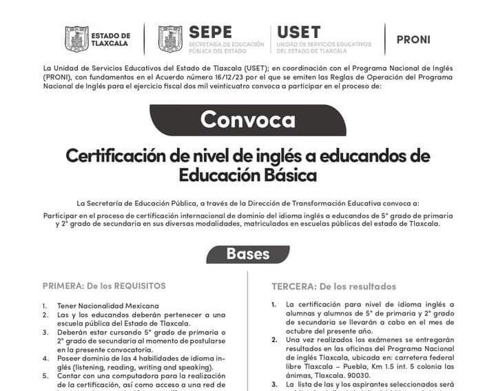 La Secretaría de Educación Pública del Estado y la Unidad de Servicios Educativos del Estado de Tlaxcala (SEPE-USET), en coordinación con el Programa Nacional de Inglés (Proni), convocan a estudiantes de quinto grado de primaria y segundo año de secundaria, en sus diversas modalidades de escuelas públicas, a participar en el proceso de certificación internacional de dominio del idioma inglés.