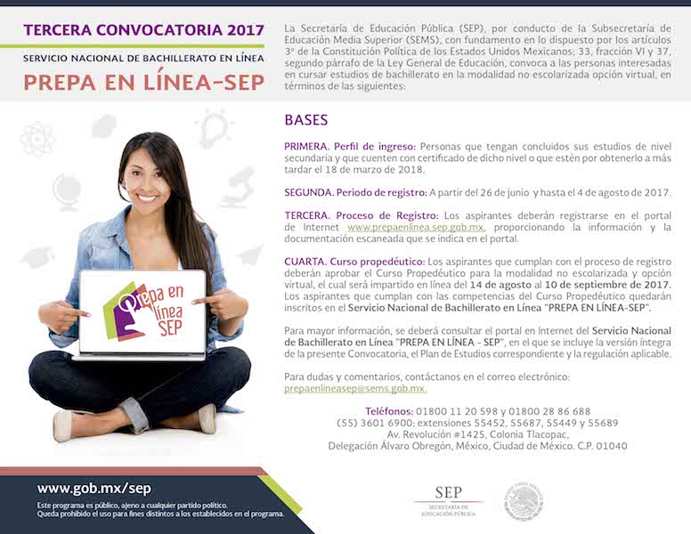 Para mayor información, los interesados pueden llamar a los teléfonos 01 800 11 20 598, 01 800 28 86 688 o al (55) 3601 69 00 exts. 55687, 55449 55451. O bien, consultar las bases enwww.prepaenlinea.sep.gob.mx.
