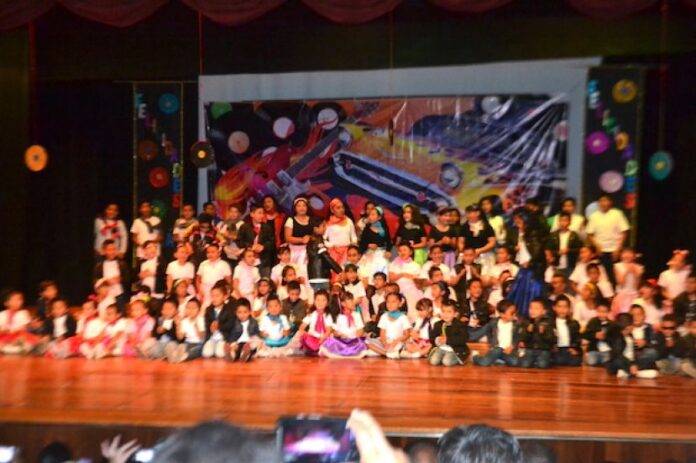 Puesta en escena del homenaje que ayer rindieron en el Teatro del IMSS de Tlaxcala a sus papás y mamás, los alumnos de kínder y primaria del Colegio J. Charbel.