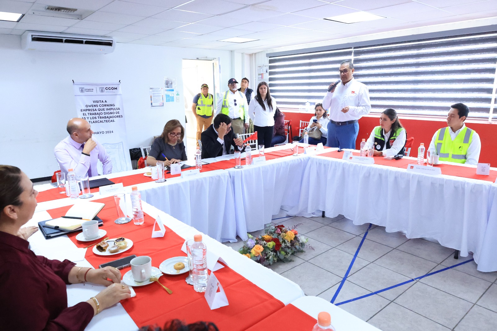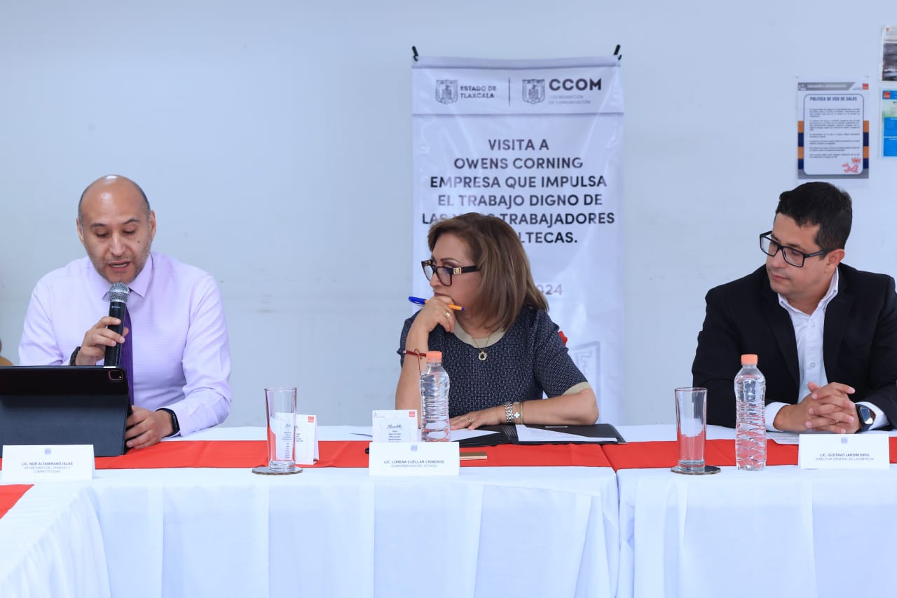 La gobernadora del estado, Lorena Cuéllar Cisneros, visitó la empresa Owens Corning, ubicada en Ciudad Industrial Xicohténcatl (CIX), donde se reunió con ejecutivos de la compañía, quienes recibieron el distintivo «Empresa que Impulsa el Trabajo Digno”.