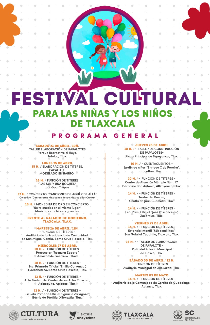El Gobierno del Estado, a través de la Secretaría de Cultura (SC) de Tlaxcala, invita a la población en general a disfrutar del Festival Cultural para Niñas, Niños y Adolescentes a celebrarse del 23 al 30 de abril, con motivo del festejo del día de las niñas y niños.
