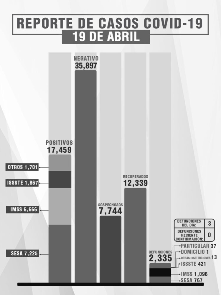 Mientras, del total de fallecimientos, 767 se han registrado en la SESA, mil 96 en el IMSS, 421 en el Issste, 13 en otras instituciones, uno en domicilio particular y 37 en hospital privado.