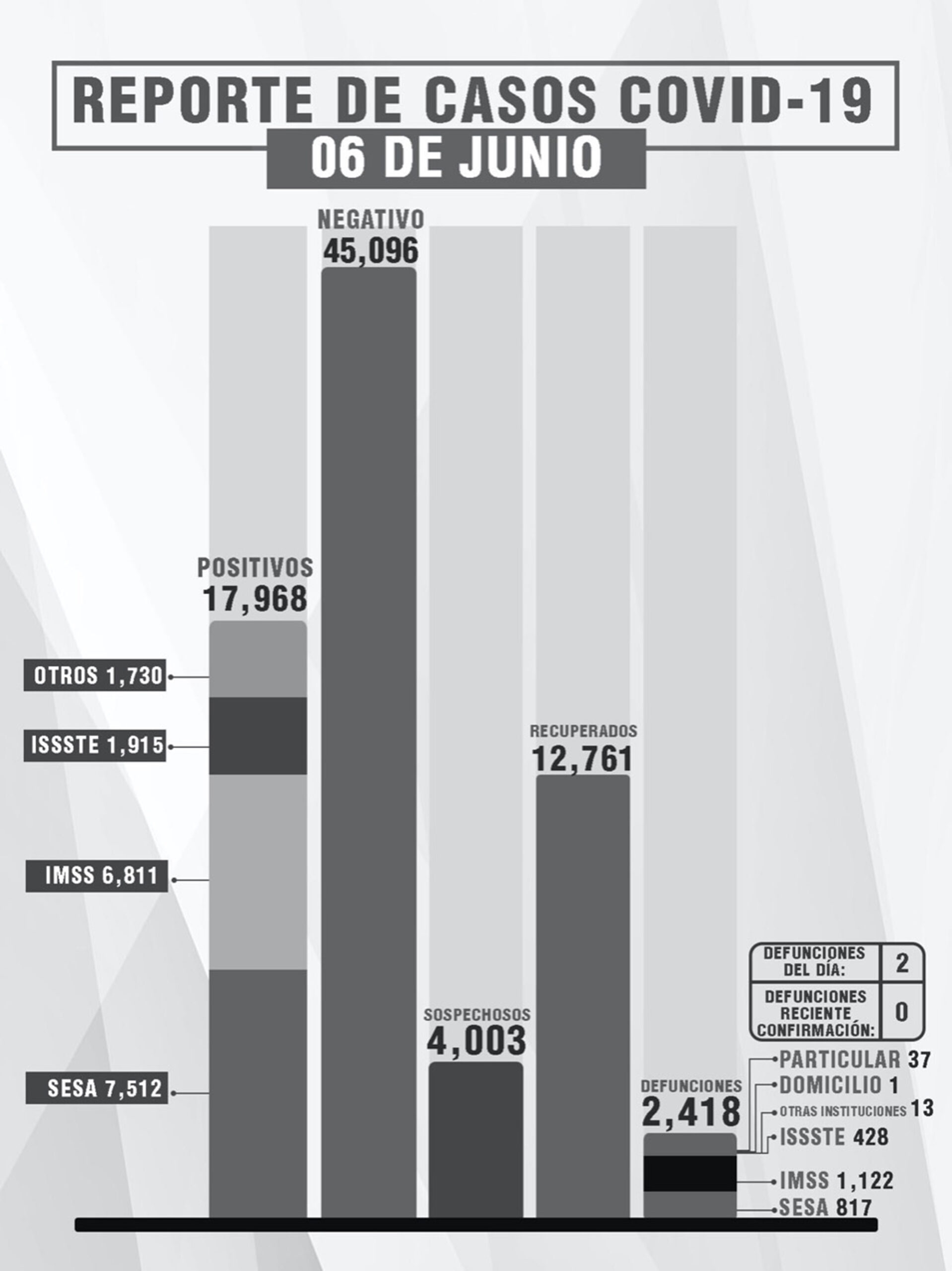 De esta manera, el estado registra 12 mil 761 personas recuperadas, 17 mil 968 casos positivos y dos mil 418 fallecimientos.