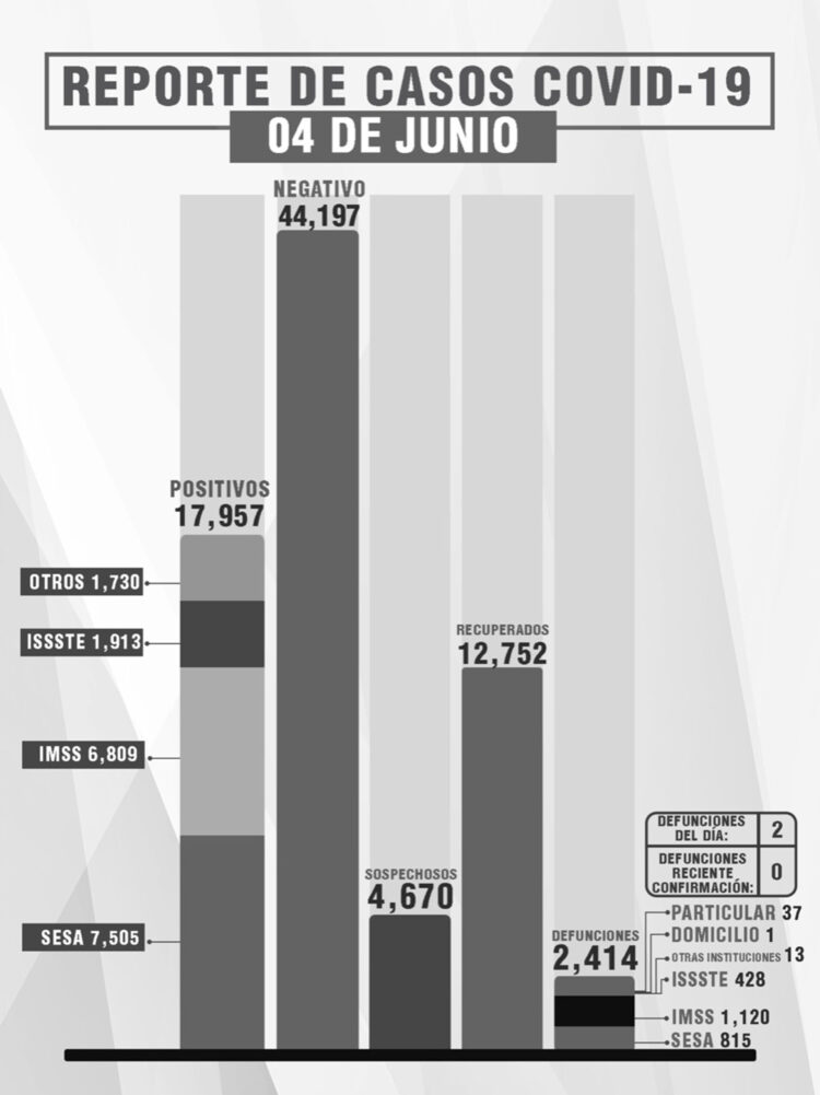 De esta manera, el estado registra 12 mil 752 personas recuperadas, 17 mil 957 casos positivos y dos mil 414 fallecimientos.