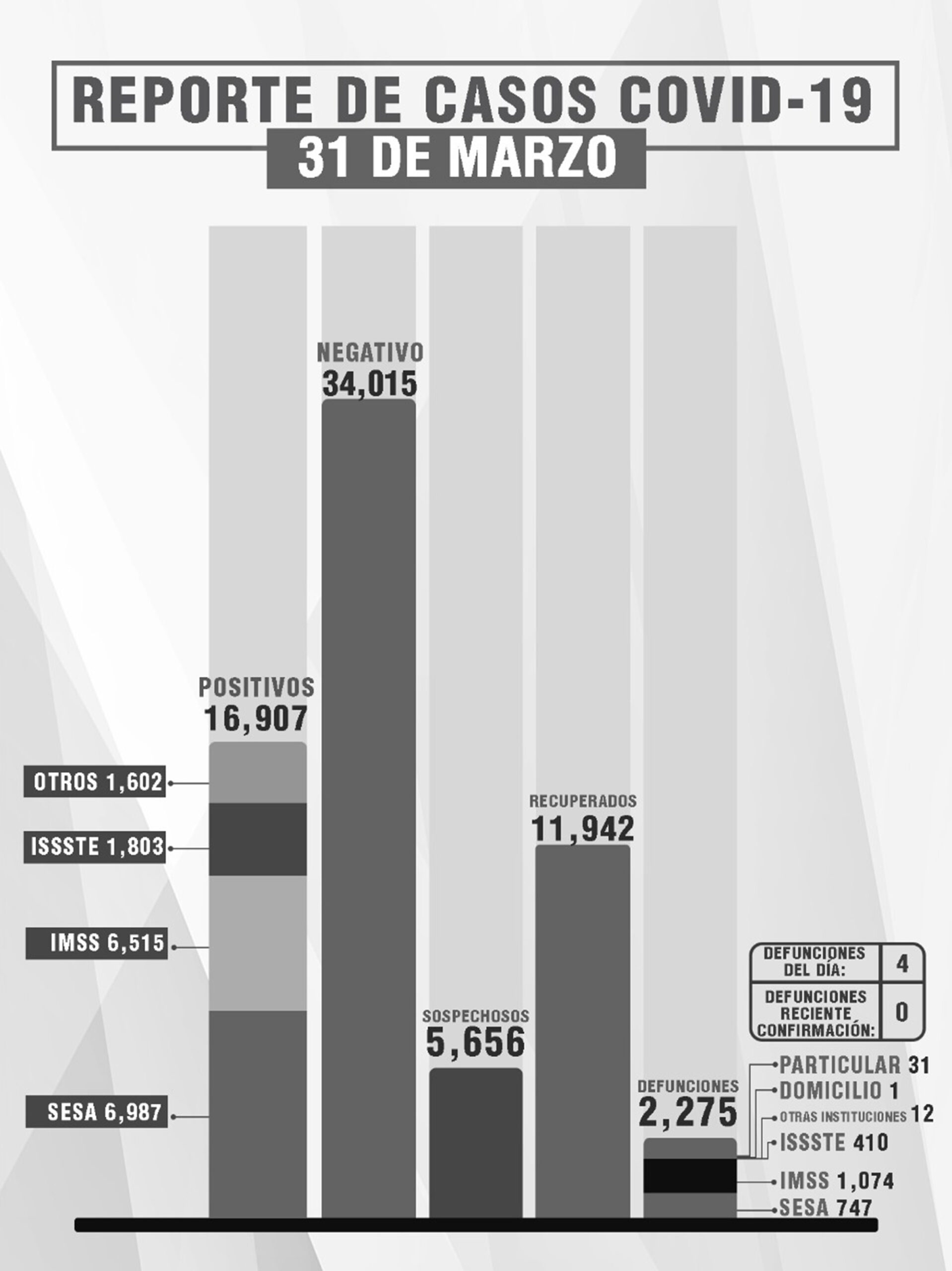 Mientras, del total de fallecimientos, 747 se han registrado en la SESA, mil 74 en el IMSS, 410 en el Issste, 12 en otras instituciones, uno en domicilio particular y 31 en hospital privado.