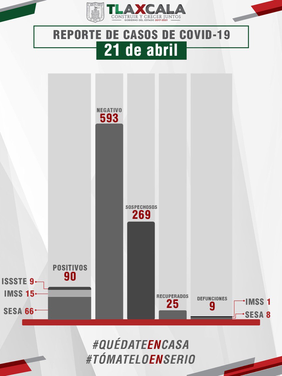La Secretaría de Salud (SESA) confirmó cinco casos y un fallecimiento más por Covid-19 en Tlaxcala, con lo que la entidad registra 90 contagios, 25 personas recuperadas de la enfermedad y nueve fallecimientos