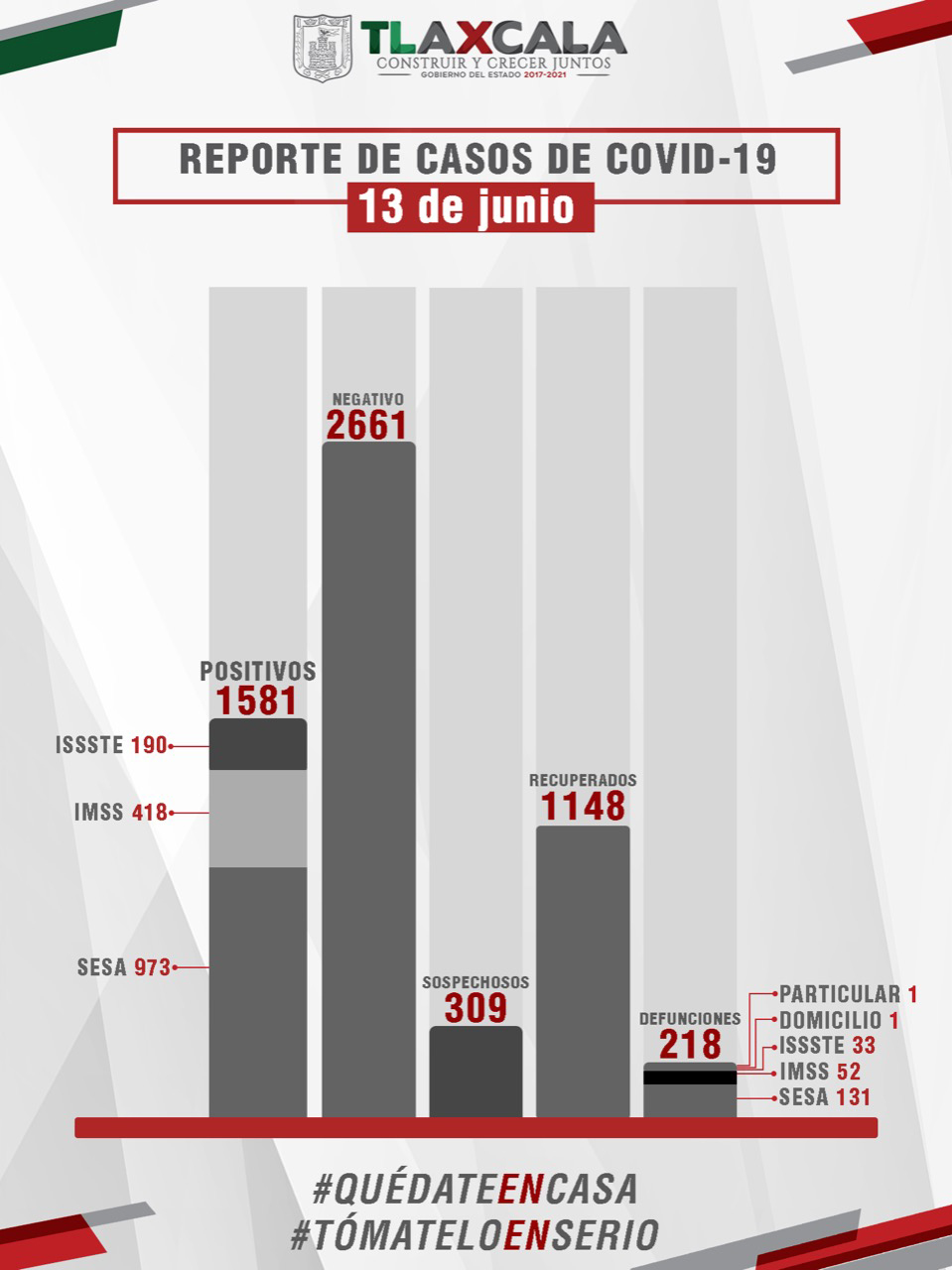 De esta manera, la entidad registra mil 581 casos positivos, mil 148 personas recuperadas y 218 fallecimientos.