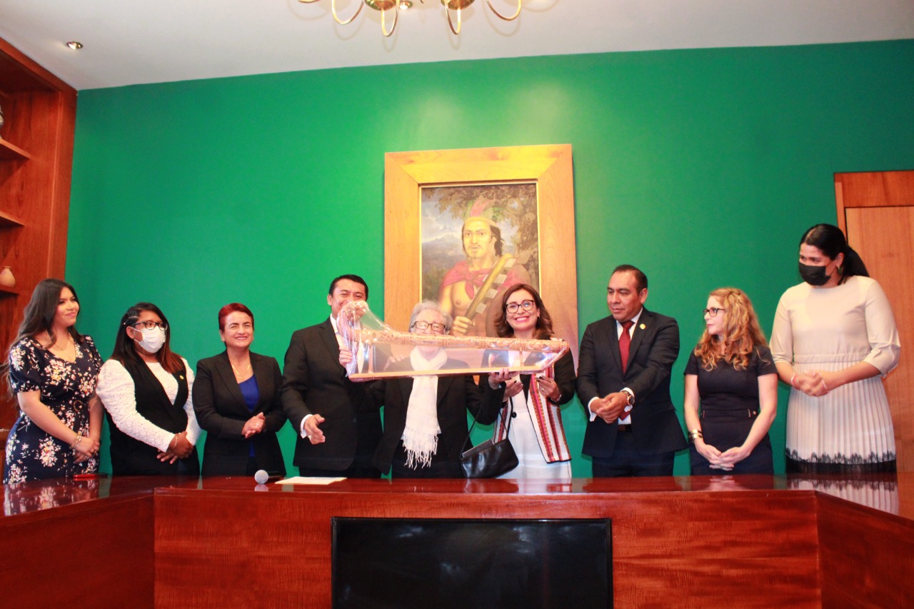 En el Salón Verde del Palacio Legislativo, la presidenta de la Comisión Permanente y el presidente de la Junta de Coordinación y Concertación Política (JCCP), Reyna Flor Báez Lozano y Rubén Terán Águila, respectivamente, junto con las diputadas Diana Torrejón Rodríguez, María Guillermina Loaiza Cortero, Brenda Cecilia Villantes Rodríguez, Marcela González Castillo y Lorena Ruiz García, así como el diputado Miguel Ángel Caballero Yonca, entregaron un reconocimiento y el bastón de mando por mejorar las condiciones de vida, tanto del municipio de Tlaxco de donde es originaria como de todo el Estado.