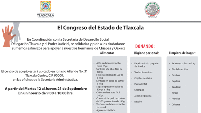 Por acuerdo de la LXII legislatura local, los diputados Arnulfo Arévalo Lara, Presidente de la Mesa Directiva y Sandra Corona Padilla Presidenta de la Comisión de Juventud y Deporte; presentaron la convocatoria, en la cual solicitan a todos los tlaxcaltecas se sumen en la donación de víveres para apoyar a nuestros hermanos de Chiapas y Oaxaca; quienes se vieron severamente afectados por el sismo de 8.2 grados registrado la semana anterior.