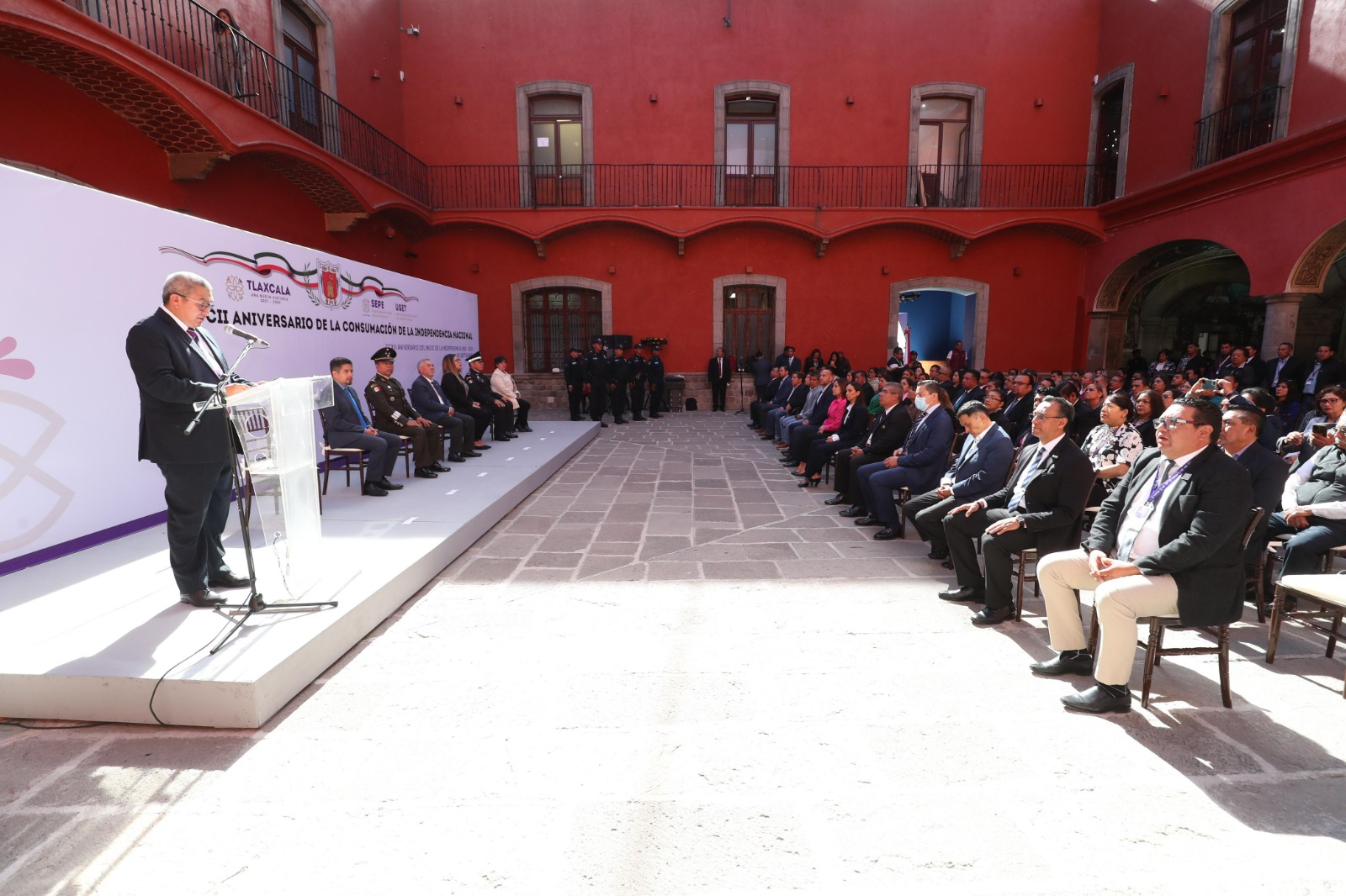 El secretario de Gobierno, Sergio González Hernández, en representación de la titular del Ejecutivo local, Lorena Cuéllar Cisneros, encabezó la ceremonia cívica del CCII aniversario de la Consumación de la Independencia Nacional, celebrada en el Patio Central de Palacio de Gobierno.