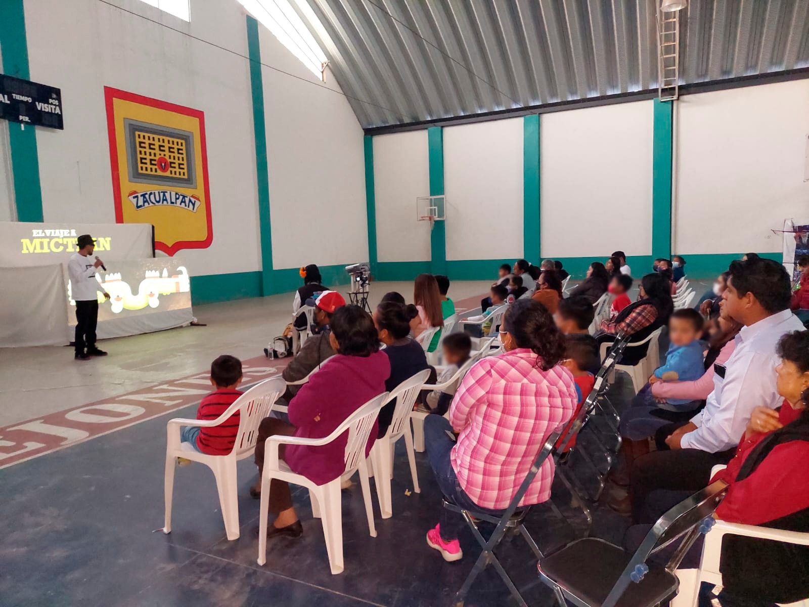 En el marco del Día Mundial del Teatro para Niños y Jóvenes, que se celebró el 20 de marzo del presente año, la Secretaría de Cultura (SC) presentó la puesta en escena “El viaje al Mictlán” en el municipio de San Jerónimo Zacualpan, con la asistencia de 350 personas, entre menores de edad y padres de familia.