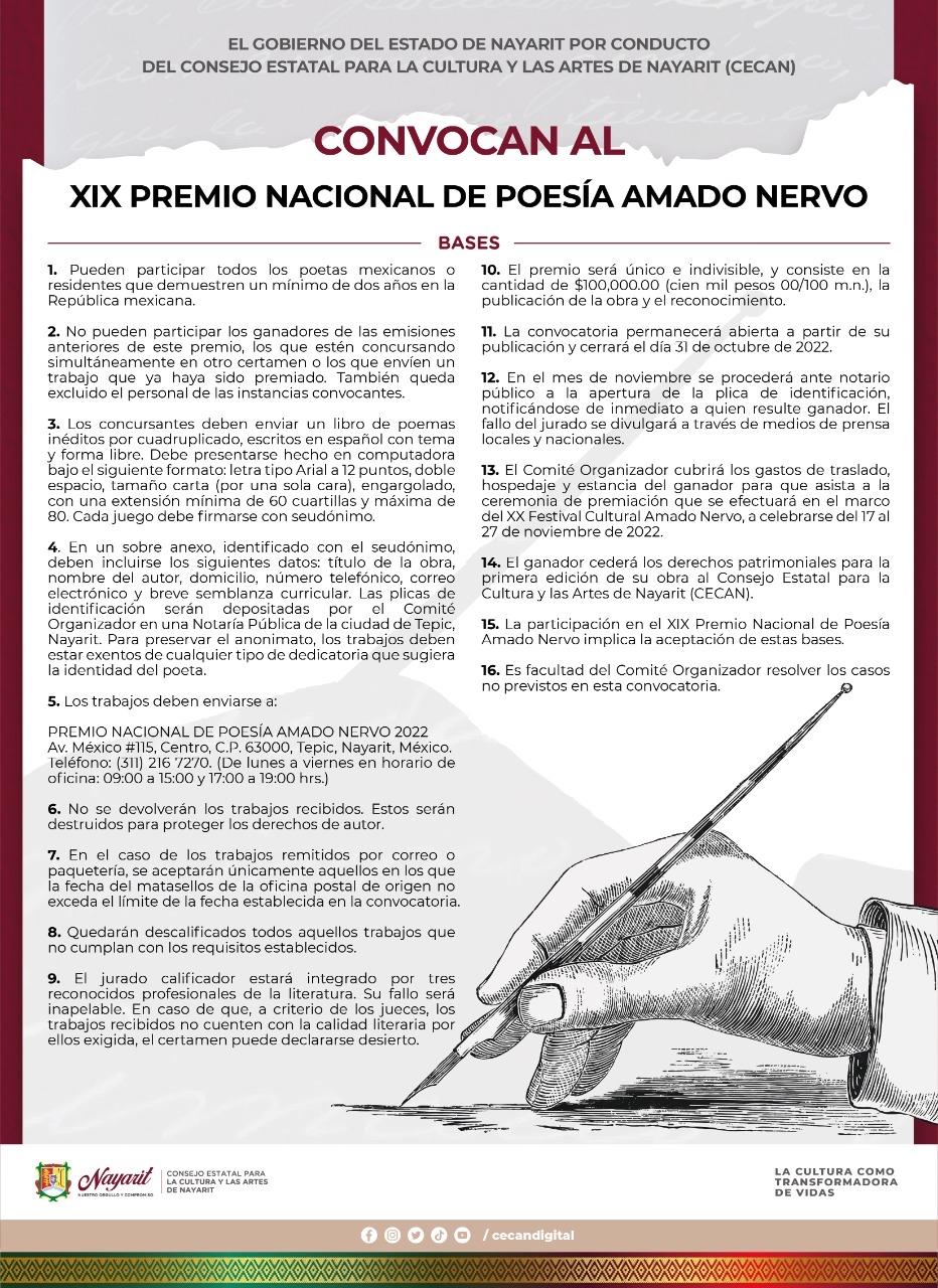 La convocatoria del XIX Premio Nacional de Poesía Amado Nervo, queda abierta a partir del 1 de septiembre y hasta el próximo 31 de octubre de 2022, y la participación de las personas concursantes implica la aceptación de sus bases.