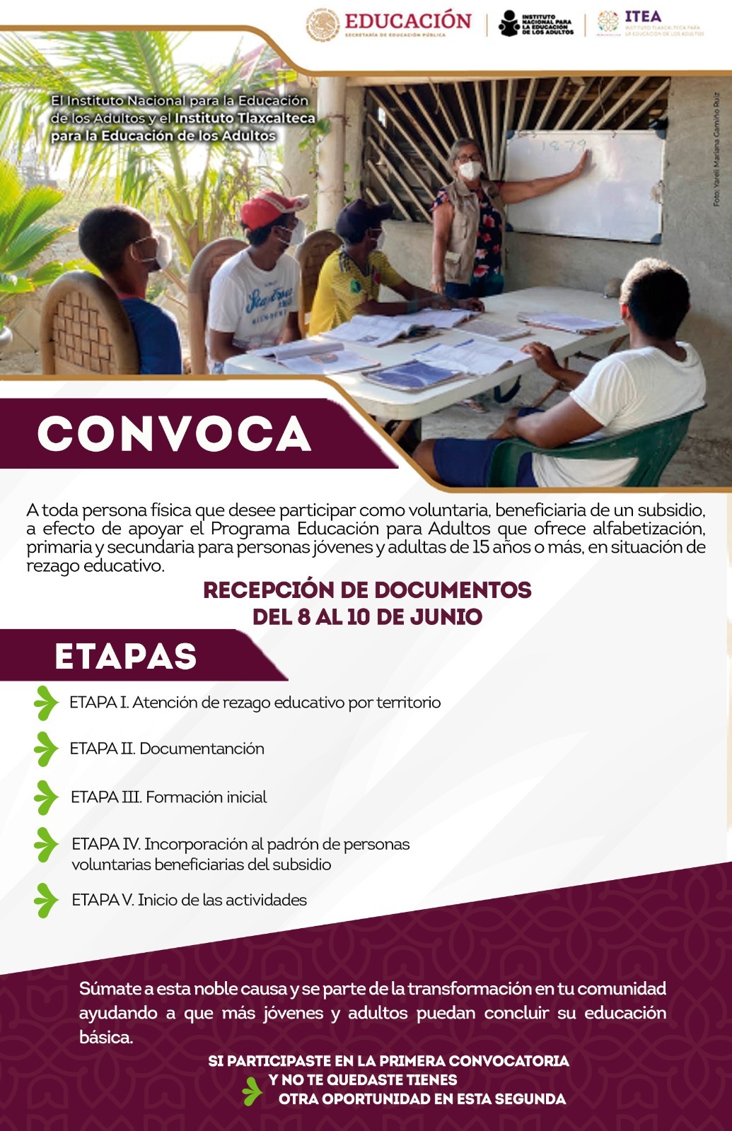 Los institutos Nacional para la Educación de los Adultos (INEA) y Tlaxcalteca para la Educación de los Adultos (ITEA) invitan a las personas mayores de 18 años de edad con bachillerato concluido o inconcluso, a registrarse como Persona Voluntaria Beneficiaria de Subsidio (PVBS).