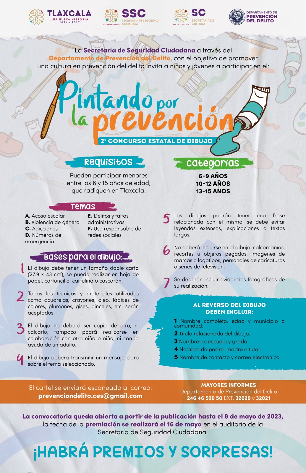 La convocatoria queda abierta a partir de su publicación y hasta el 8 de mayo. La premiación se realizará el 23 de mayo en el auditorio de la SSC, ubicado en calle Xicohténcatl, número 13, colonia centro, en el municipio de Tlaxcala.