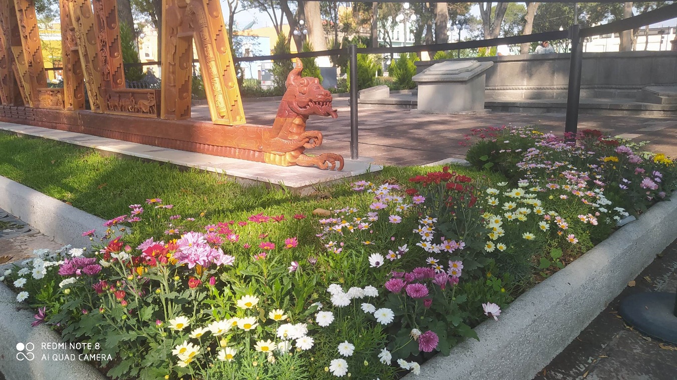 En torno a la talla del nombre de la ciudad, apiñadas florecillas aportan un toque de alegría multicolor a las letras de Tlaxcala. Sin embargo, más allá, en la jardinera que da a la puerta principal de Palacio de Gobierno, un campo de lavandas exuda un aire ciertamente salvaje…
