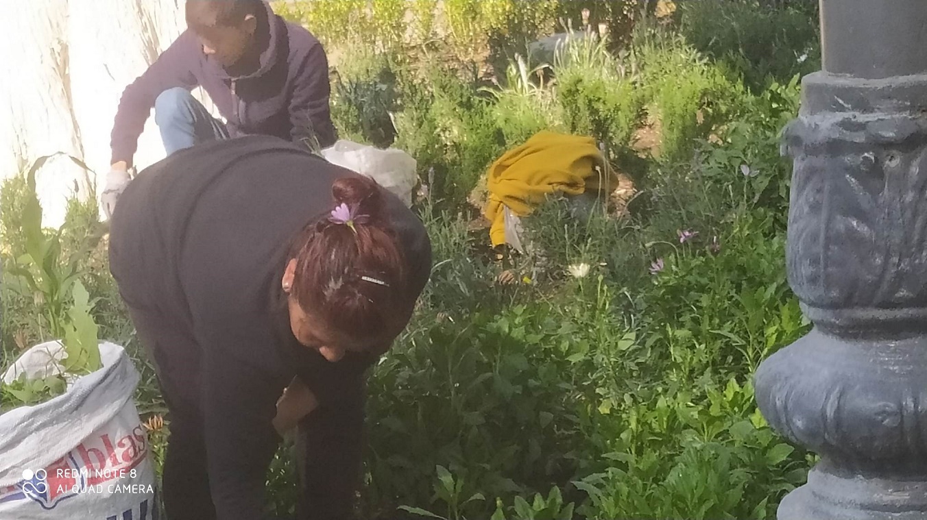 Del lado del hotel San Francisco, una señora y un jovencito están arrancando maleza.