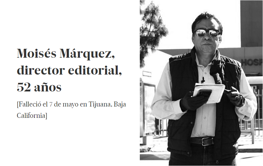 El periodista Moisés Márquez fue noticia de primera plana dos veces en su vida: por su nacimiento y por su muerte. El 15 de septiembre de 1967, un diario de su localidad natal, Guaymas, en Sonora, les dedicó la portada a él y a su madre por el tamaño extraordinario del recién nacido: más de 5 kilos. Más de medio siglo después, llegó a la primera página de Infobaja, la revista de la que era director editorial en Tijuana. Un retrato suyo sonriente, como aparece en todas las fotos en las que no está trabajando, acompaña al título Apasionado por la noticia en el homenaje póstumo que hicieron sus compañeros el 14 de mayo, una semana después de que falleciera por coronavirus.