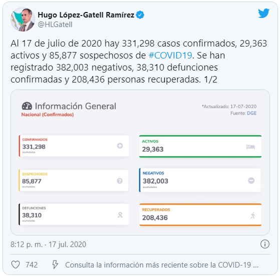 Desde Chiapas, el subsecretario de Salud ofreció además una estimación de la situación real que pone en 40 mil 209 la cifra de decesos y hasta 372 mil 099 el total de contagiados (la mayoría de los cuales han superado la infección o son asintomáticos) durante cuatro meses de pandemia. Estas cifras son conservadoras en comparación con otras estimaciones.