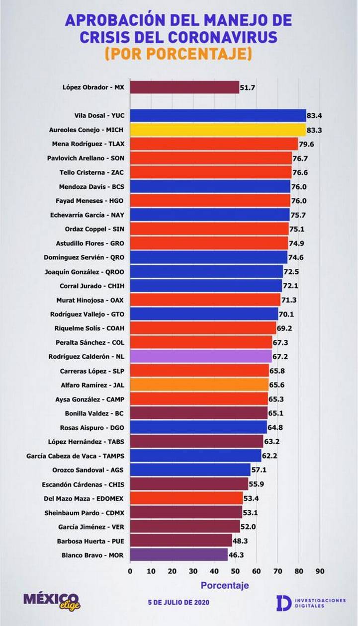 Cinco gobernadores, Mauricio Vilas (83%) de Yucatán, Silvano Aureoles (83%) de Michoacán y Marco Mena (80%) de Tlaxcala, así como la sonorense Claudia Pavlovich (77%) y el zacatecano Alejandro Téllez (77%), encabezan el top de Gobernadores mexicanos mejor evaluados por su gestión de la pandemia del covid, según la última encuesta de México Elige.