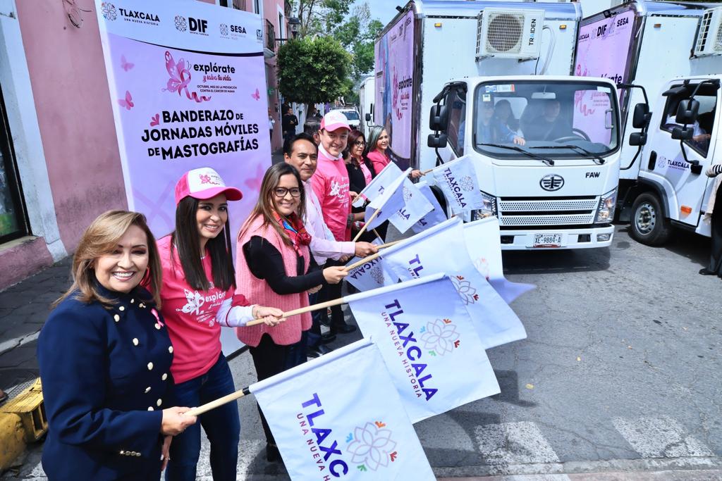 La gobernadora Lorena Cuéllar Cisneros encabezó el inicio de la campaña permanente de la lucha contra el cáncer de mama “Yo Actúo Tlaxcala”, donde dio banderazo a las Jornadas Móviles de mastografías y ultrasonidos mamarios, las cuales recorrerán los 60 municipios de la entidad, con el objetivo de prevenir, detectar y atender oportunamente esta enfermedad.