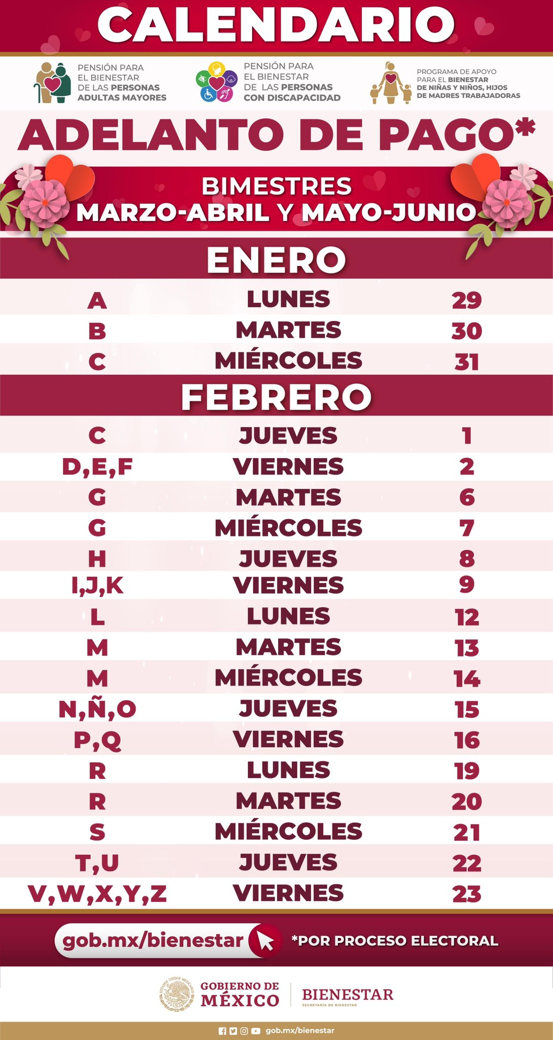 Para brindar mejor atención, el depósito se realizará de acuerdo con la letra del primer apellido, conforme al siguiente calendario: