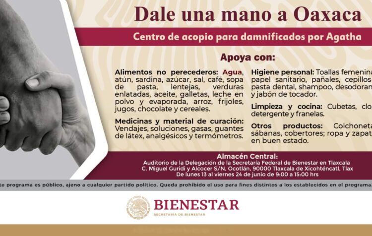 Es momento de demostrar la solidaridad del pueblo tlaxcalteca con nuestras hermanas y hermanos oaxaqueños. Tras el paso del huracán Agatha por las costas del Pacífico, más de 25 localidades de Oaxaca aún se encuentran en estado de emergencia. Por esta razón, la Delegación de la Secretaría de Bienestar en Tlaxcala, invita a todas las dependencias federales en el estado, así como organismos públicos municipales y población en general, a participar en la colecta de víveres.
