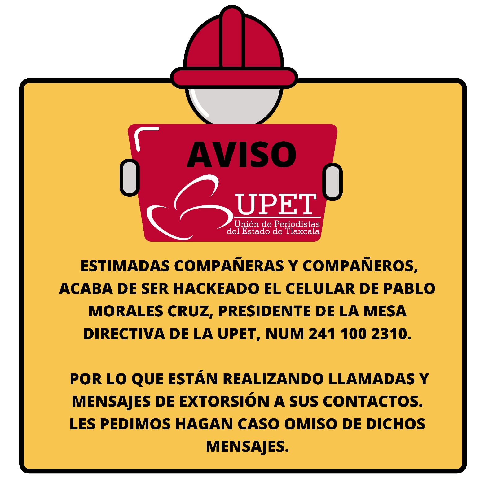El Presidente de la Unión de Periodistas del Estado (UPET), Pablo Morales Cruz, denunció que esta tarde hackearon su cuenta de WhatsApp desde su número de celular personal 241 100 23 10, por lo que hizo un llamado a no caer en intentos de extorsión que sean enviados a su nombre.
