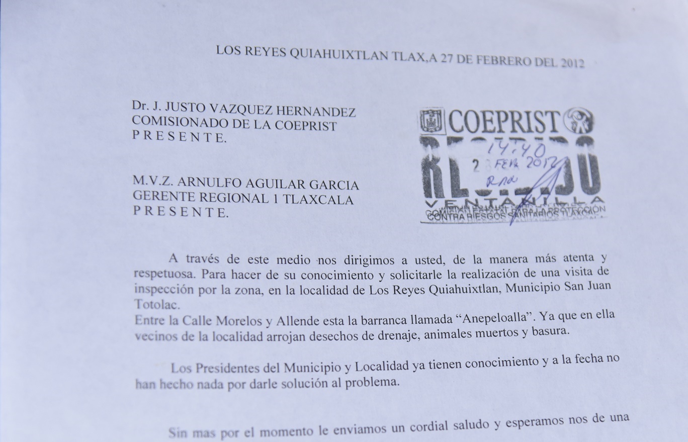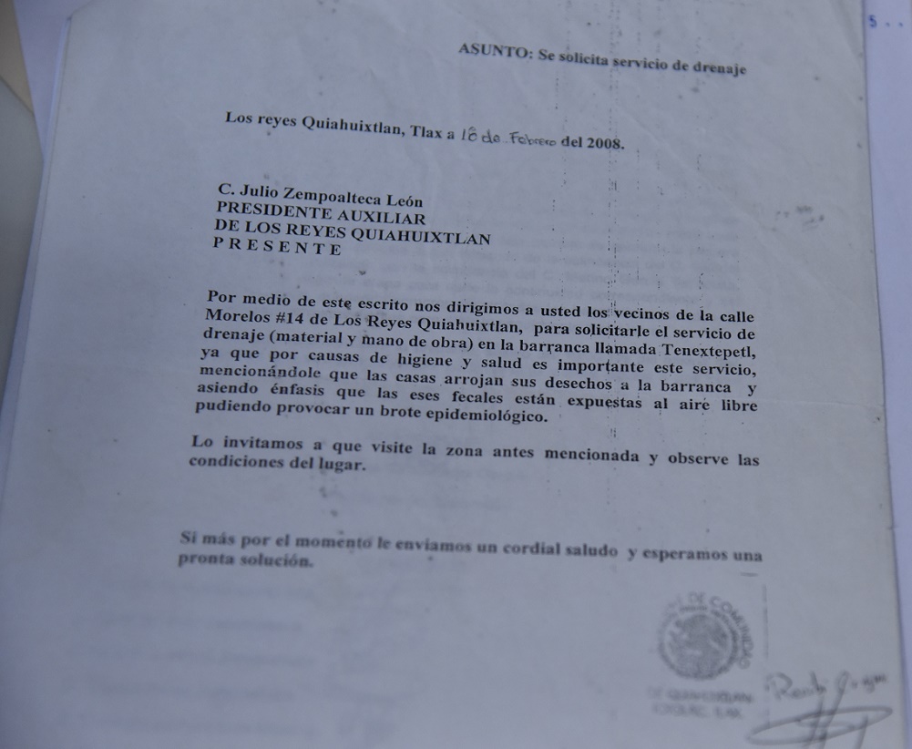 Al respecto, la joven madre mostró un oficio de 2008 dirigido por vecinos de la calle Morelos al entonces presidente auxiliar de Los Reyes, Julio Zampoalteca, al que solicitaron construir un drenaje en la barranca Tenextépetl, a la sazón empleada como sitio de desagües domésticos.