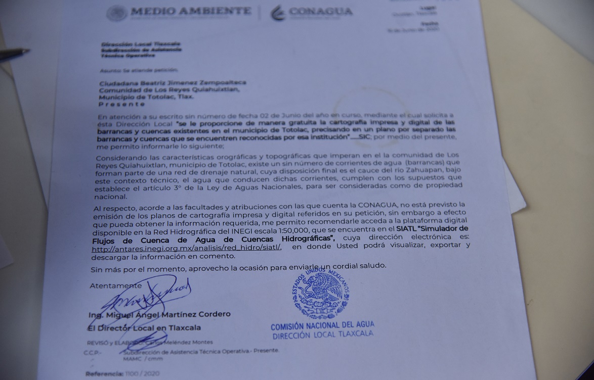 La denuncia signada por Beatriz y Julia Jiménez Zempoalteca se sustenta en un oficio de Conagua que confirmó a la primera, en 2020, que las barrancas que desaguan al río Zahuapan “son consideradas como de propiedad nacional”.