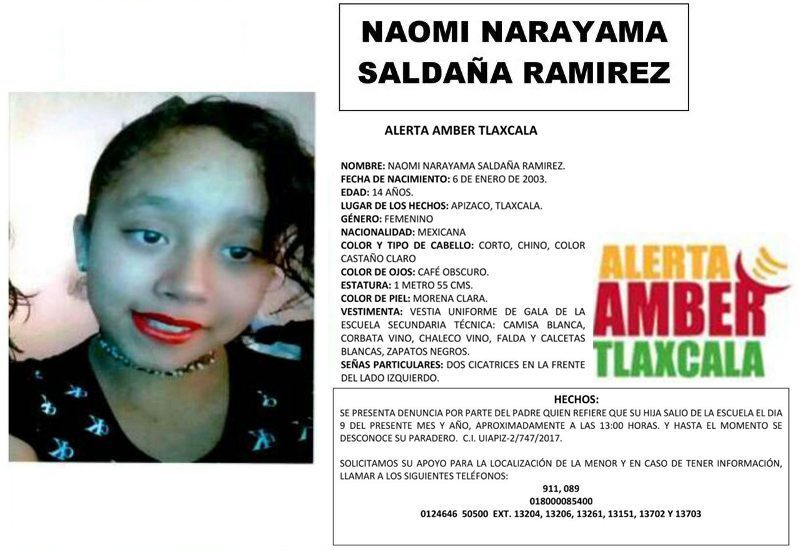 “Estimados amigas, amigos, conocidos y compañeros, les pido por favor que quienes sepan o tengan algún dato de mi hija Naomi Narayama Saldaña Ramírez, por favor se comuniquen al teléfono celular 2414109163, ya que desapareció el dia de ayer 9 de octubre del presente año de la Escuela Secundaria Técnica No.37 de Santa Úrsula Zimatepec”, posteó el padre.